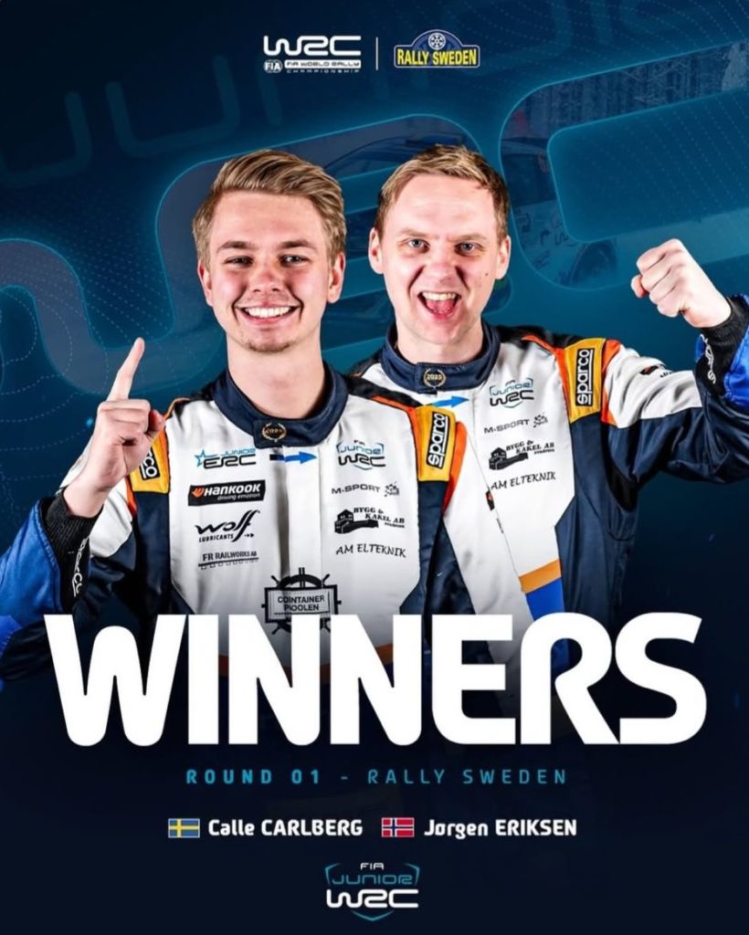 Det ble den reneste parademarsjen for svenske Calle Carlberg og Jørgen Eriksen fra Kongsvinger. Etter å ha vunnet både junior-EM og EM for Rally4 i fjorårets sesong, har de tatt steget opp i Junior-VM der alle kjører Ford Fiesta Rally3-biler. Overgangen til denne bilen og dette mesterskapet var ikke noe problem for Calle og Jørgen i deres aller første løp i årets VM. De vant ikke mindre enn 12 av de 18 fartsetappene i junior-klassen. De åpnet litt forsiktig, men tok ledelsen allerede fra SS3 på fredag formiddag og ga den aldri fra seg.