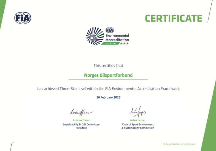 I februar var Norges Bilsportforbundet gjenstand for revisjon i forhold til FIAs miljøakreditering, FIA Environmental Accreditation, og det ble et gledelig resultat som gjør at NBF fortsatt har høyeste sertifisering, 3 Stjerner.