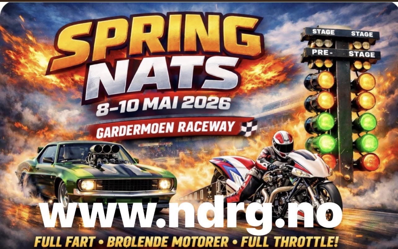 Ja, våren er på god vei og vi nærmer oss første dragrace arrangement på Gardermoen Raceway. Endelig har vi kommet oss igjennom en lang vinter, hektisk aktivitet i mange garasjer om dagen og det skal kjøres Spring Nat`s dragrace, Bil og MC. Vi skal gjennomføre 3 dager med Dragrace og vi forventer mange team som skal være med. Nå skal dragrace team, bil og mc, få teste ut om kjøretøyene holder mål og ikke minst førere. Det blir jo ekstra spennende da vi kjører NM og EDRS (European Dragracing Series)